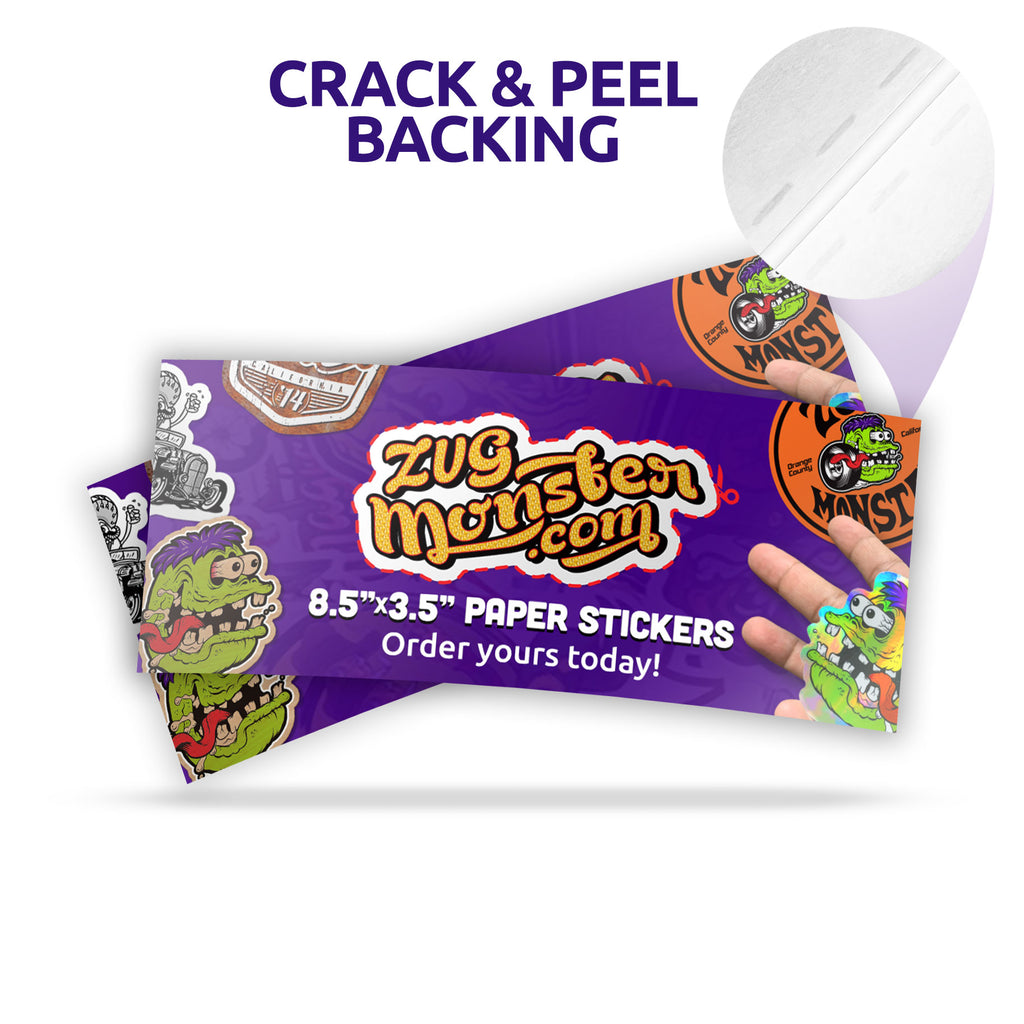 Our new "crack and peel" paper sticker backing features slits that allow for easy peeling and application of the sticker.